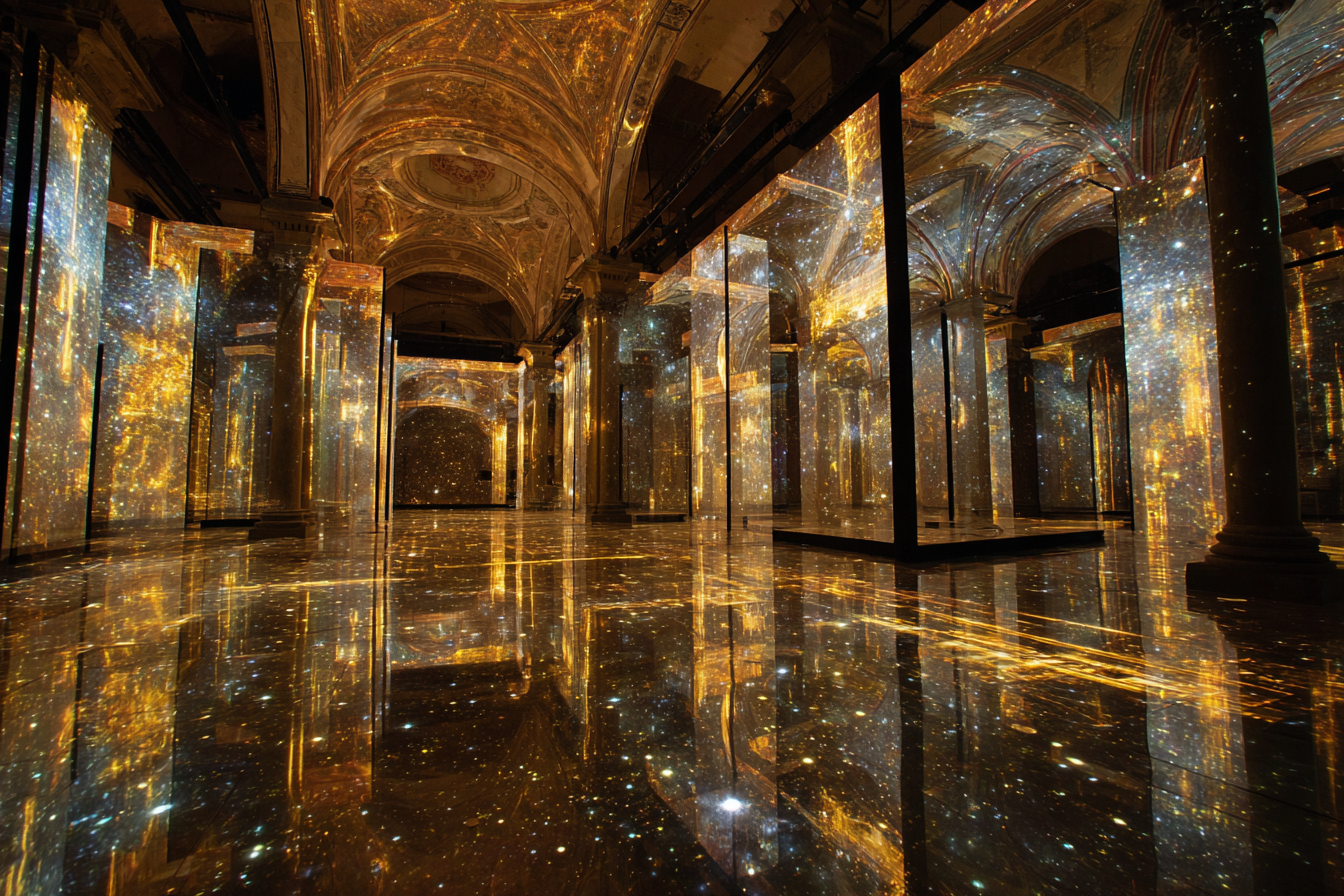 Our work ranges from historical and architectural transformations — such as the immersive video installation in Perugia’s Rocca Paolina, where motion graphics, CG animation and sound design reshaped an entire underground fortress — to contemplative and multisensory experiences like The Canticle, which combines light, image, and spatial audio to create an emotional, meditative journey.